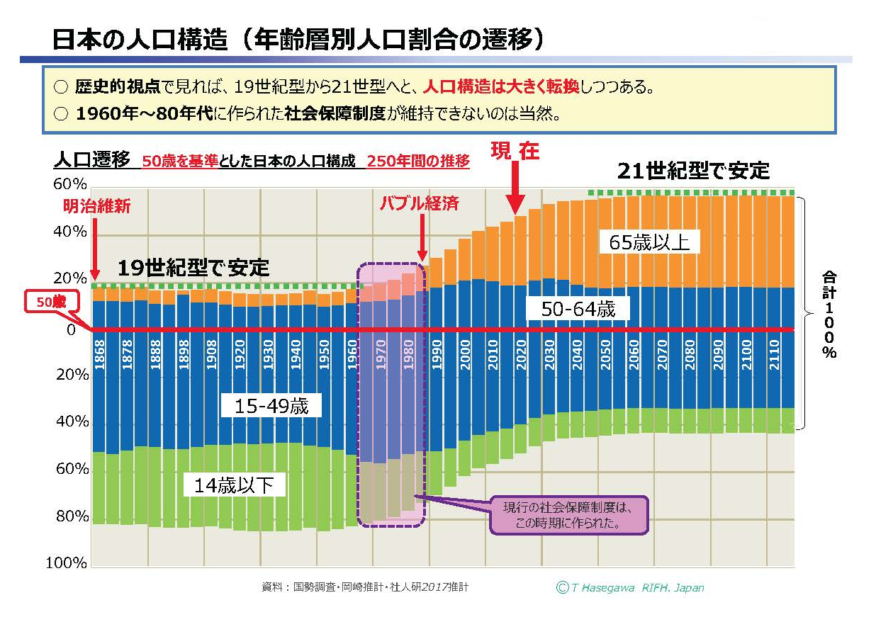 江崎氏によれば、1960年代までの日本の人口構成は、長く「19世紀型」が続いてきたという。そして、現行の社会保障制度は1980年代に完成したもの だそうだが、人口構成は、既に、上図のような21世紀型に変化しつつある。19世紀型に基づいた社会保障制度が、新しい人口構成には合致していないのだか ら、それを認めて、早急に「制度を変える」必要がある、と氏は述べた。つまり、(今後の、起きないかもしれない技術革新を安易に期待するのではなく、) 「常識を変える」という視点に立てば、今、問題視されている高齢者の医療費が増大しているという社会保障制度の課題も、対策が可能になるというのだ。確か に、現在から2060年までの間に0歳から64歳までの人口は減ってゆくけれど、他方、65歳以上の人口は上図のように一定のところで安定する。つまり、 高齢者は今後は「増えない」のだから、適切な制度改革で対策が可能になるのだ、と氏は説得力のある意見を述べた。 ところで、19世紀型の人口構造に沿った医療制度とは、次のようなものであったそうだ。当時の国民は、栄養不足や不衛生、また、戦争による暴力などから、 「感染症」や「けが」で簡単に命を落としたという。老人や子供などの大勢が結核などの感染症で亡くなったのだから、そうした「単一標的型」の疾患に効く新 薬を開発すれば、患者の治療満足度を上げることができたそうだ。それが効果を上げた結果、現在の医薬品の検査方法も、病気の原因を一つに定め、化学物質な どでそれを阻害することによる効果を統計的に確認するという方法が取られているという。